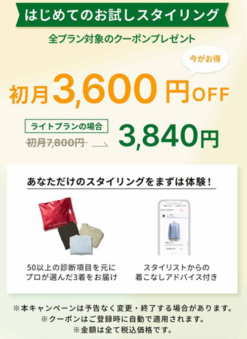 | 特典 | 『はじめてのお試しスタイリング』が初月3,600円OFF |