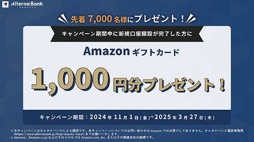 オルタナバンクでは、期間中に申込から30日以内に新規口座開設を完了するとAmazonギフト券が1,000円もらえるキャンペーンを開催しています。