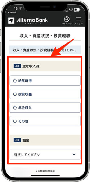 - 画面の内容に従って収入・資産状況・資産経験について回答します。