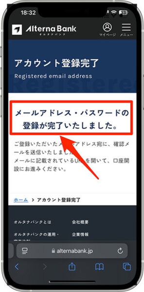 - 『アカウント登録完了』と出たら、オルタナバンクから届いたメールをチェックしてください。