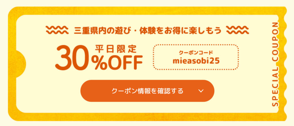 三重の県内の遊び体験が30%オフになるクーポンが配布中!