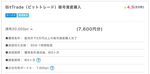 ポイントインカム経由でビットトレードの口座を開設すると、最大で7,600円分のポイントがもらえます。