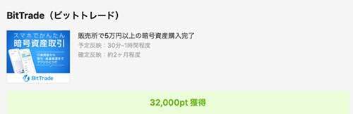 ビットトレードのポイントサイトは、口座解説・本人確認完了・50,000円以上販売所での取引が付与条件です。