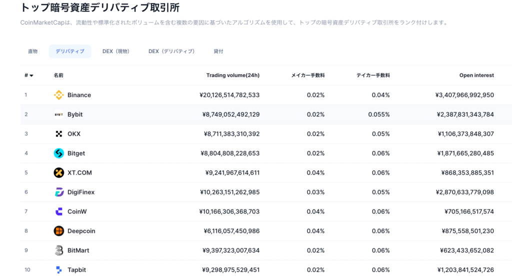 CoinMarketCapのトップ暗号資産デリバティブ取引所ランキングによると、現在Bybitは全世界2位の取引高です。