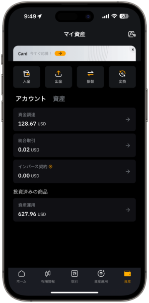 - 右下の「資産」からマイ資産のページに移動し、「入金」をタップします。