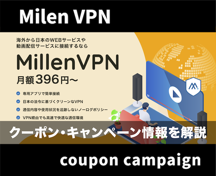 Milen VPNはお得に利用できるクーポンやキャンペーンはあるの? 今回はそんな疑問にお答えします! 海外旅行や海外で長期的に仕事をすることになった場合、国によっては動画配信サービスやSNS、Webサイトが見られないことがあります。 日本にいるときと同... -