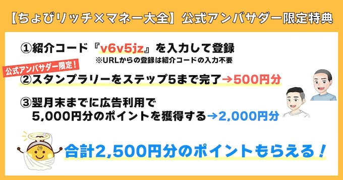かず結論、ちょびリッチでは公式アンバサダーの紹介コード『v6v5jz』を入力して会員登録すると、限定特典として最大2,500円分のポイントが貰えます!