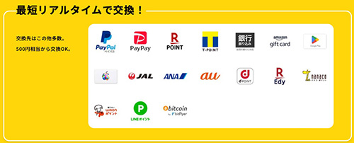 貯めたポイントは現金に交換できるだけでなく、PayPayやAmazonギフトカードなどにも交換でき、最低交換額は500円です。