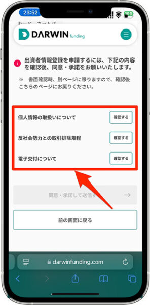 • 『個人情報の取扱いについて』『反社会勢力との取引排除』『電子交付について』の3つの項目を確認します。