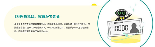 一口一万円から投資でき、投資後は値動きや価値の上下をチェックする必要はないので、ほったらかしで投資できる点が魅力的。