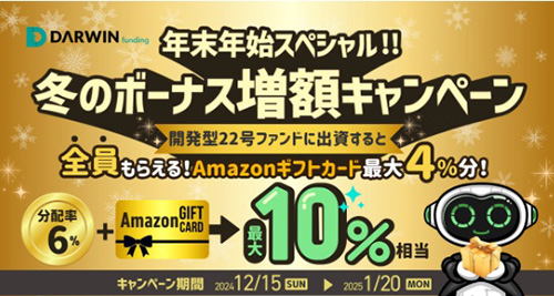 ダーウィンファンディングでは、Amazonギフト券が最大10%もらえる冬のボーナス増額キャンペーンを開催しています!