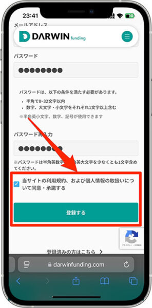 • 『当サイトの利用規約、および個人情報の取扱いについて同意・承諾する』にチェックを入れ、『登録する』をタップします。