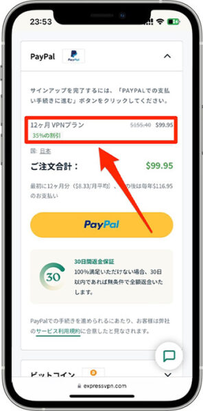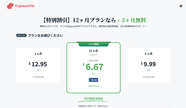 ExpressVPNのプランは上記の3種類となっており、それぞれ割引を使うと通常よりも安い料金になります。