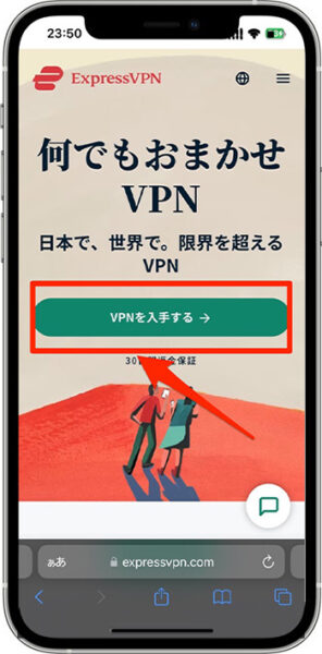 - ExpressVPNの公式サイトにアクセスし、『VPNを入手する』をタップします。