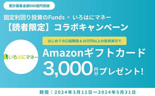 Fundsでは、過去に新規で口座を開設して30万円以上の投資を行うと、Amazonギフト券が3,000円分もらえるキャンペーンを実施していました。