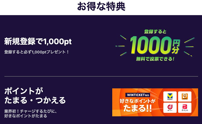 お金をチャージして投票するかわからない方も、まずは無料でもらえる1,000円だけでももらっておくのがおすすめです。