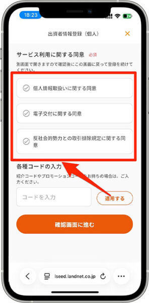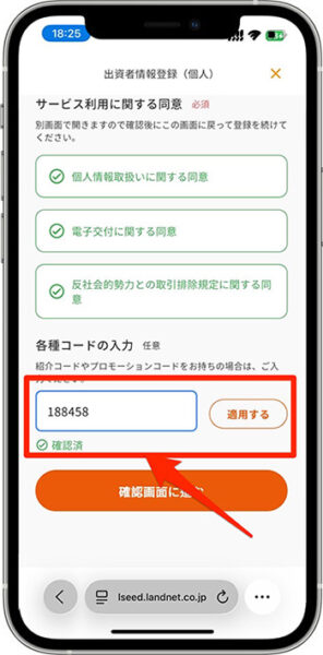 • 紹介コードを入力し、『適用する』をタップしたら、『確認画面に進む』をタップします。