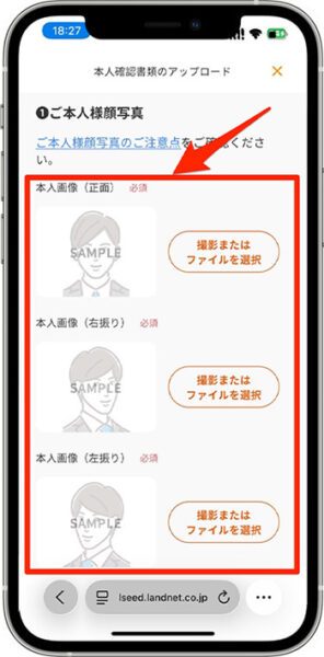 • 『ご本人様顔写真』を3パターン撮影し、アップロードします。