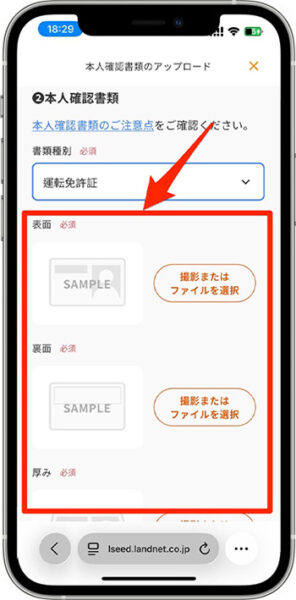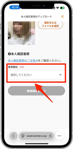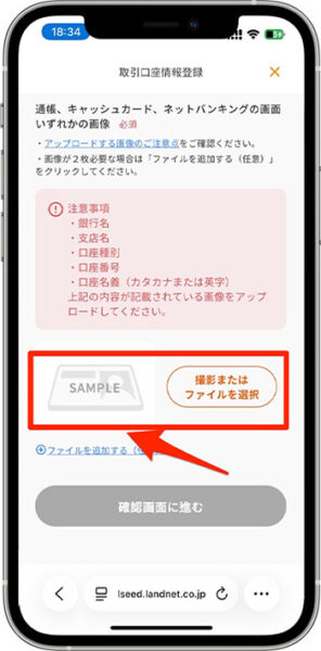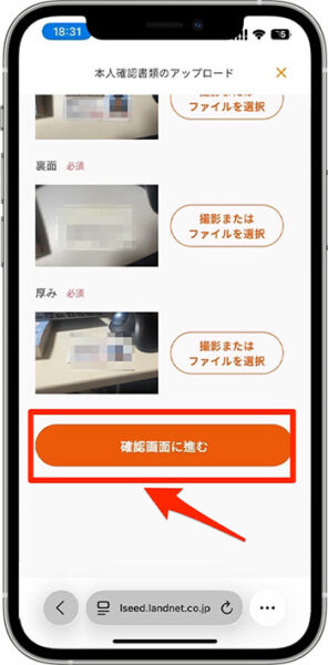 • 『確認画面に進む』をタップし、続いて『本人確認書類をアップロードする』をタップします。
