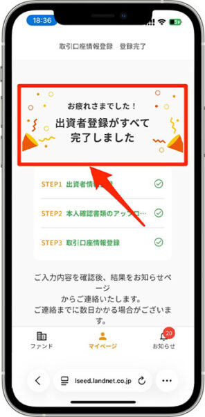 • 『出資者登録がすべて完了しました』と表示されたら、申し込みは完了です。