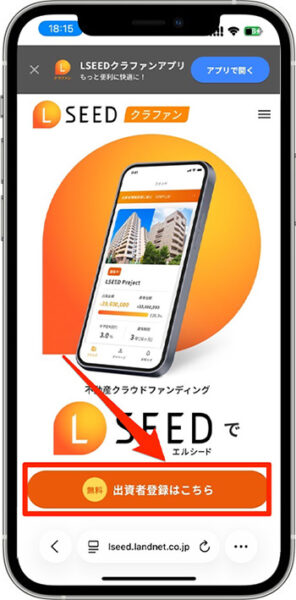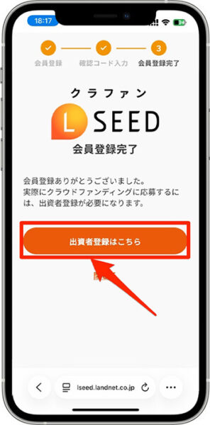 • 公式サイトへアクセスし、『出資者登録はこちら』をタップします。