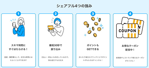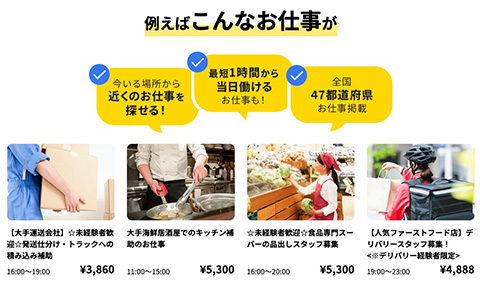 | スキマバイト | 空き時間を利用してできる 働きたい時に手軽なバイトが見つかる |