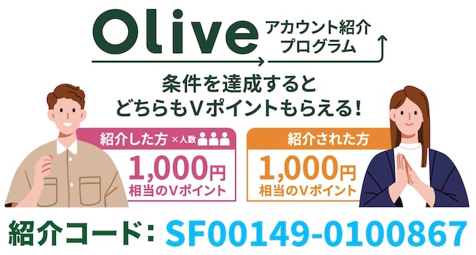 そんなOlive(オリーブ)では紹介コード『SF00149-0100867』を入力してアカウント作成をすると、1,000円相当のVポイントがもらえます!