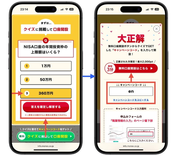| キャンペーンコード | なし ※クイズに正解後表示される |