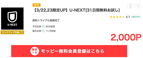 モッピーでポイントが稼げるおすすめの案件の1つ目は、VODなど無料で即ポイントが付与される案件です。