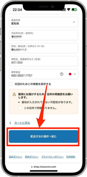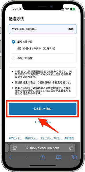 - 配送方法を選択し、『お支払いへ進む』をタップします。