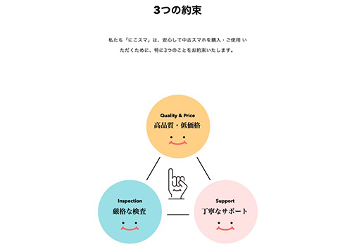 にこスマでは『高品質・低価格』『厳格な検査』『丁寧なサポート』の3つを約束しており、高品質なスマホを低価格で、気軽に購入できると人気があります。