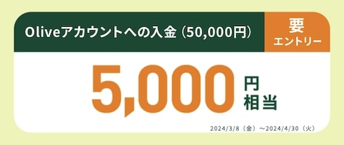 - 獲得条件①:キャンペーンにエントリー&Olive口座にて一度に3万円以上の給与受取り