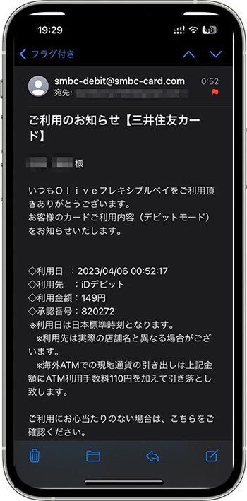 Olive(オリーブ)からメールで以下のように利用明細が届くため、間違いがないか確認してください。