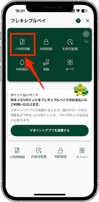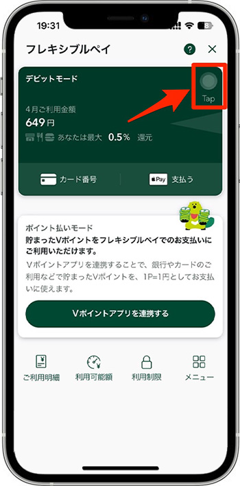 アプリを開き、フレキシブルペイをデビットモードにしたあと、右上の『〇Tap』をタップし、『ご利用明細』をタップしてください。