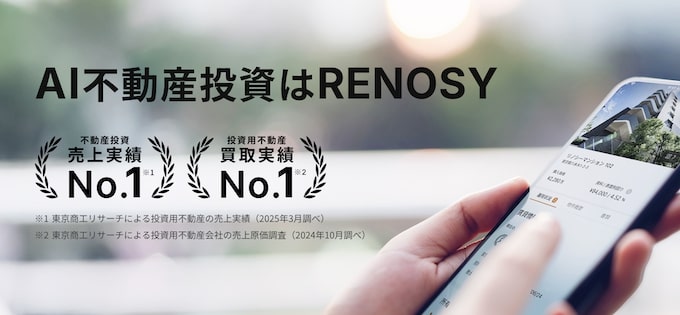 | RENOSY(リノシー) | 不動産投資業界トップシェア 年収500万円以上の会社員・公務員 医師・士業の方におすすめ ※ 東京商工リサーチによる不動産投資の売上実績(2025年3月調べ) および投資用不動産会社の売上原価調査(2024年10月調べ) |