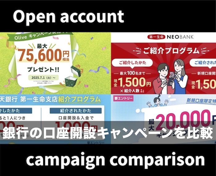 銀行口座の口座開設キャンペーンってどこがお得なの? 今回はそんな疑問にお答えします! 銀行口座は口座を開設するとお得な特典がもらえるキャンペーンを開催していますが、どこが最もお得なのか気になるはずです。 そこで今回は、銀行口座で開催中の口座... -