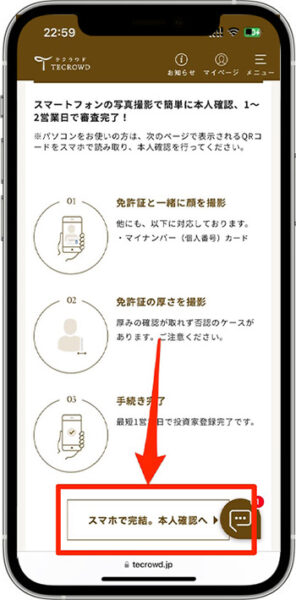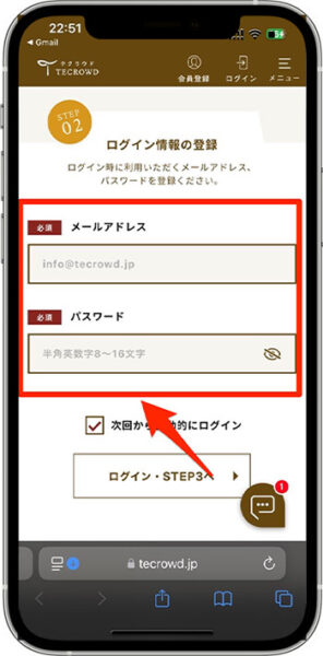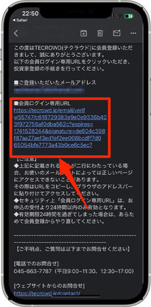 - TECROWDから届いたメールに記載されたURLをタップします。
