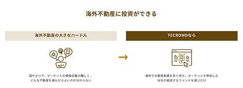 TECROWDは一口10万円から投資できる不動産クラウドファンディングで、日本だけでなく海外の不動産にも投資できます。