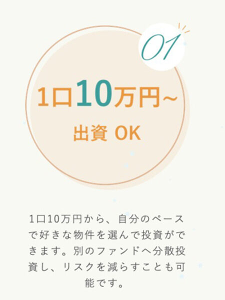 トモタクの特徴の1つ目は、1口10万円から始められる不動産クラウドファンディングということです。