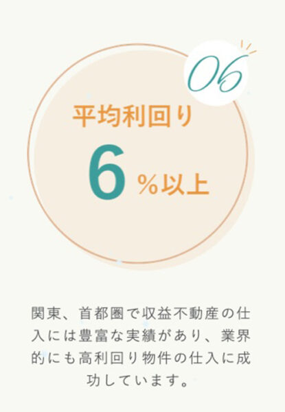平均想定利回りは6%以上となっており、これはトモタクが業界的にも高利回りの物件の仕入れに成功している成果です。