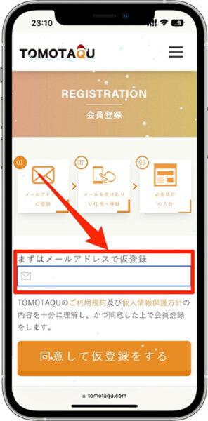 - 公式サイトにアクセスし、『まずは無料の会員登録から』をタップします。