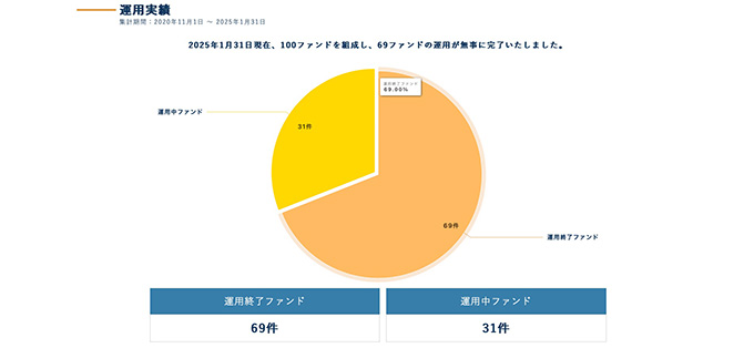 トモタクは25年1月末時点で100件のファンドを組成しており、そのうち運用が終了したファンドの数は69件。