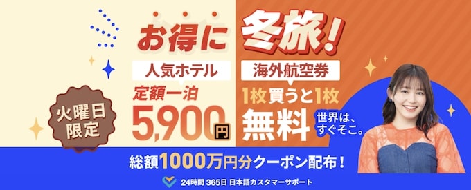 - 期間限定|ホテル5,900円OFF&航空券1枚購入で1枚無料クーポン【25/12/14まで】