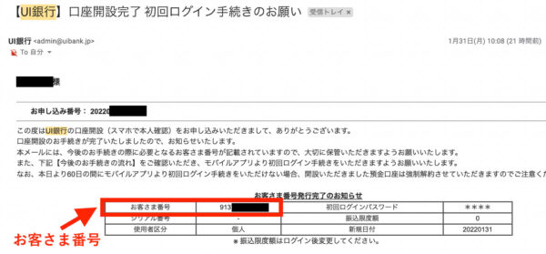 口座開設審査が完了すると、「【UI銀行】口座開設完了 初回ログイン手続きのお願い」という件名のメールを受信します。