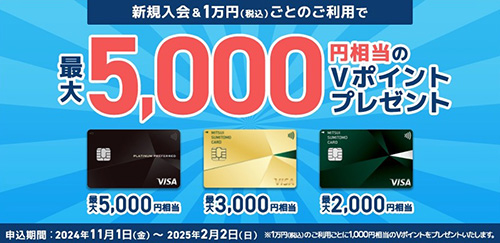 三井住友カードNLでは、新規入会&1万円ごとの利用で、最大5,000円分のVポイントがもらえるキャンペーンを実施しています。